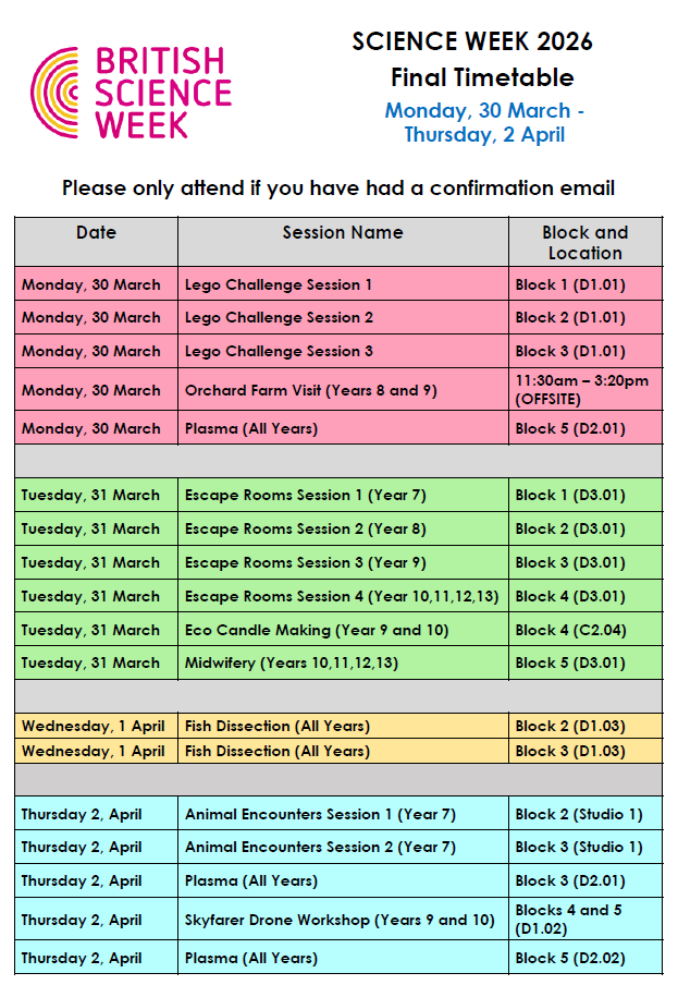 For further information on the timing for each of the individual events please see the British Science Week 2026 Final Timetable document below.